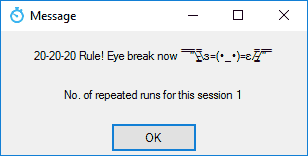 eyeBreak 20-20-20 App hides in the Windows system tray and provide a non-ignorable pop-up message reminding you to take a break from what you are working on. Encouraging you to perform eye exercises, take comfort breaks, or generally you can use the application to remind you simply to stop what you are doing and document what you are doing now.- Customizable message accepting Unicode characters for your creative smileys - 〷◠‿◠〷